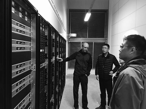 ▲瑞典林雪平超算中心,机房内的技术人员和曙光技术人员在交流。