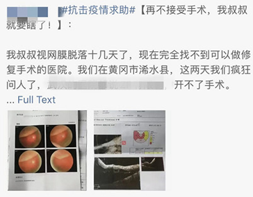 今年58岁的黄兴元家住黄冈,身为防疫工作者的他一直在各防疫站维护秩序。2月8日晚上回家后,黄兴元发现自己右眼发黑,视力下降,但以为最近太过劳累,并没有在意。2月19日,视力下降明显的黄兴元在当地医院检查,被诊断为右眼视网膜脱离,但是当地无法治疗。