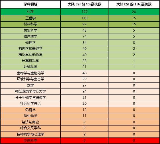 根据ESI排名2017年3月公布的数据(本轮评估中教育部所使用的版本),中国高校ESI全球前千分之一和百分之一的各个学科数量如下: