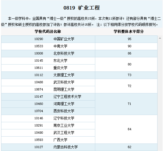 举个例子,矿业工程这一学科也是争议很大的。这一专业进了6所高校:北京科技大学、中国矿业大学、中南大学、中国矿业大学(北京)、南京大学、武汉大学。先看2012年学科评估结果: