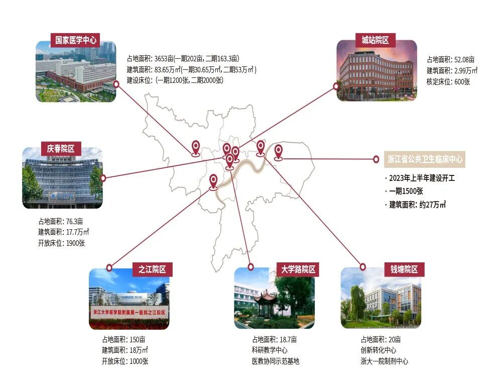 拥有总部一期(国家医学中心)、庆春院区、之江院区、城站院区、大学路科教基地、钱塘转化基地和浙江省公共卫生临床中心,开放床位5000余张。